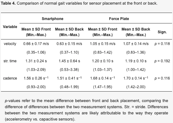 To evaluate sensor positioning effects, a separate group of 32 participants wore a smartphone in a waist pouch—either at the lower back or lower abdomen—while performing a normal walk. As there were no detectable differences in values measured from the lower abdomen compared to the lower back (which is more typical for gait and balance analyses), the authors recommend that smartphone sensors could be worn in the lower abdomen position to increase comfort for participants, potentially increasing study adherence and lowering drop-out rates.